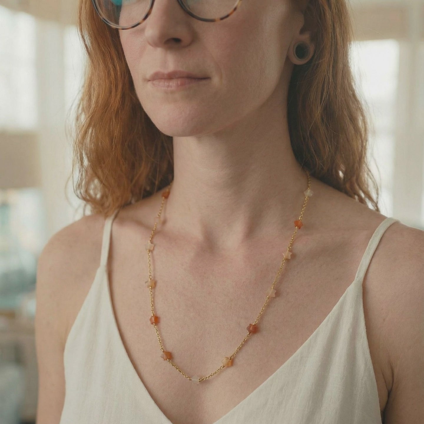 The Lantern Fairy gathered these golden stones from the Sunspire Groves of the Fay Realm, where patches of sunlight fall like liquid gold through the treetops. She plays with each star until its glow matched the warmth of a summer morning. When set into an 18K gold plated chain, the starstones hum softly with a bright, hopeful energy—as if whispering promises of good days ahead.